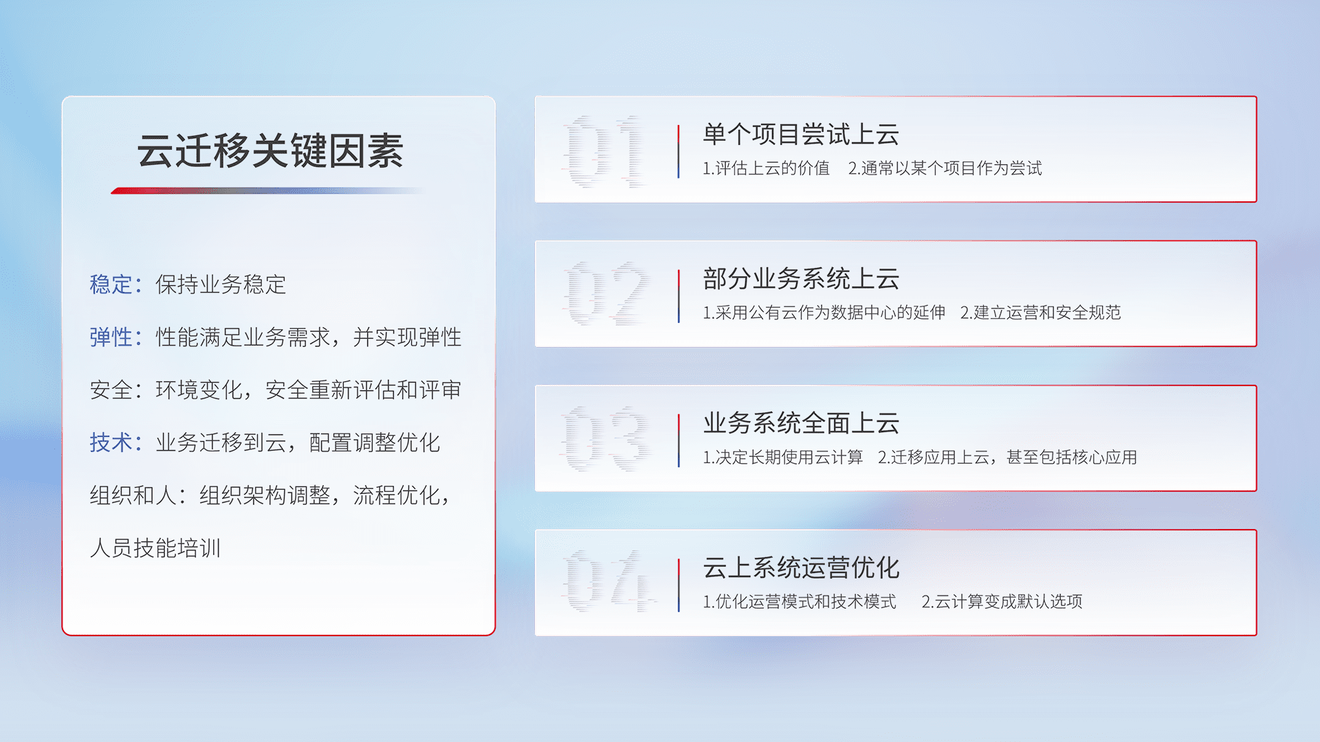 结合实际业务,,从规划设计、、、云平台选型、、云原生改造、、、、数据迁移、、、、集成交付,,迁移全过程为客户识别最佳上云路径,,做好风险识别管理,,,,设计网络架构、、、身份权限、、安全审计合规、、、、操作审计、、、日志审计、、监控告警策略、、、、多站点容灾设计等,,,,对云上基础设施进行整体规划,,,提升IT治理水平,,,,以满足弹性、、高可用、、高性能的需求。。。