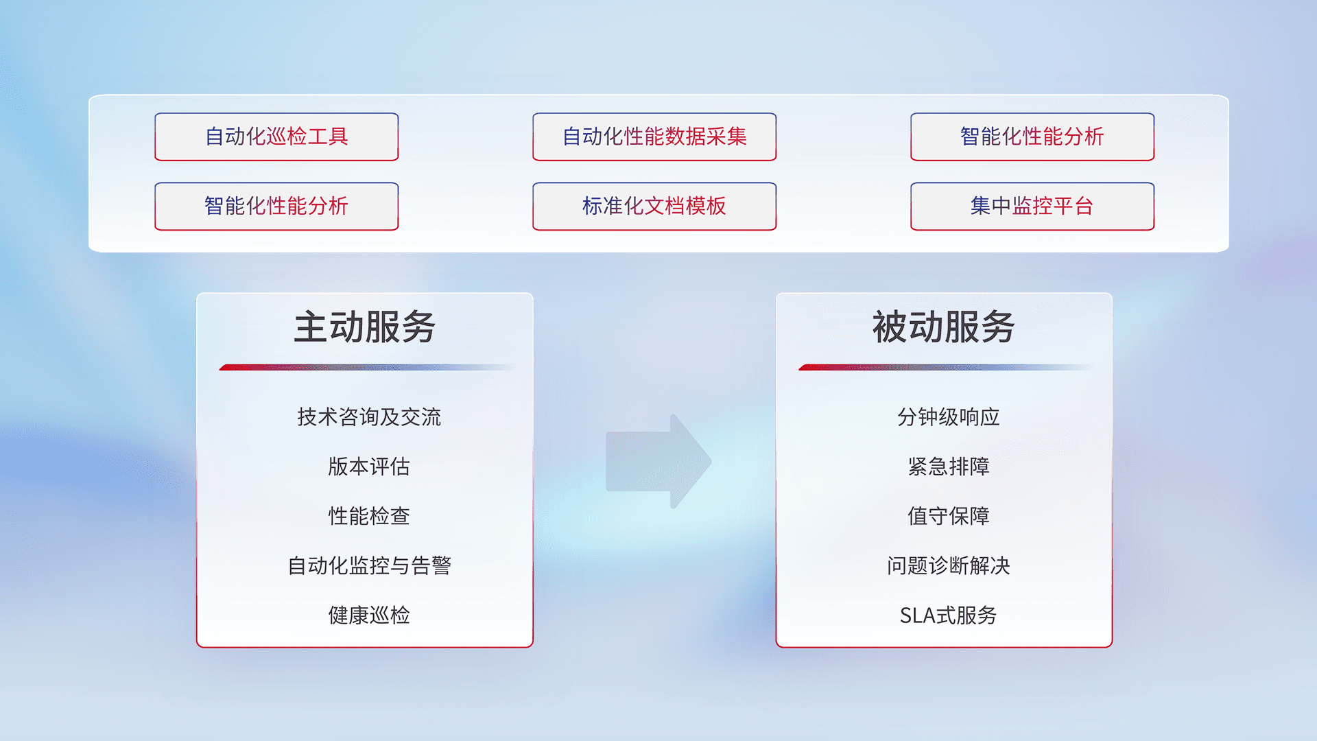 智能化工具和标准化文档,,,,保障服务质量,,提供主动服务(包含技术咨询、、、版本评估、、、性能检查、、、自动化监控与告警、、、健康巡检)和被动服务包含(分钟级响应、、紧急排障、、值守保障、、问题诊断解决、、、、SLA服务)。。